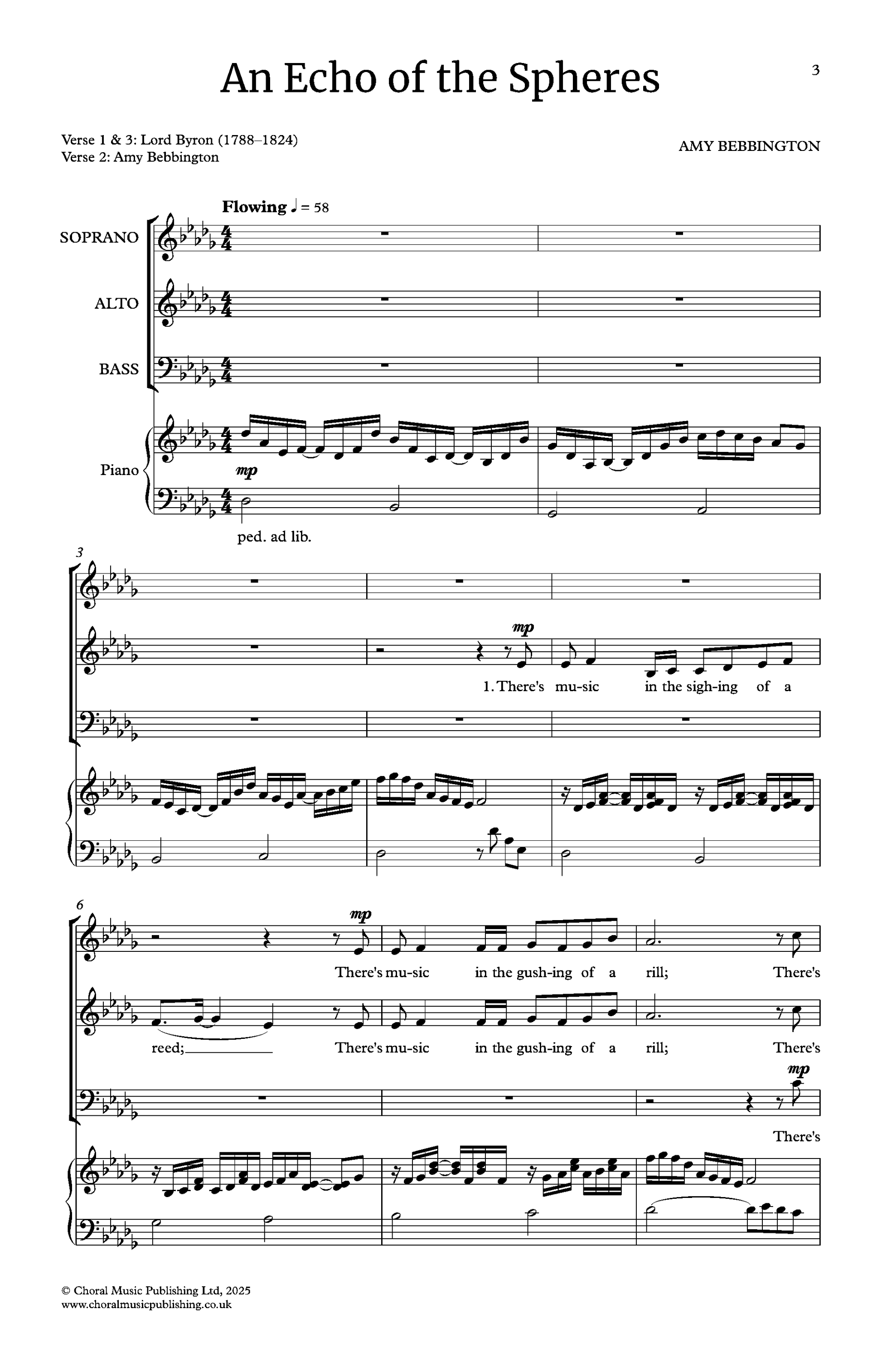 I was inspired to write this very simple and accessible piece of music after receiving news from CMP requesting secular choral works about nature. A postcard with a Lord Byron quote on it had been sitting on my desk for some time, and I felt it deserved a musical setting. I soon realised that the piece needed an additional verse, so I decided to create my own to complement the theme. The piano writing is deliberately straightforward, not too challenging, and the vocal forces (SAB/SSA) and ranges are appropriate for community and youth choirs. The message to protect all of nature’s beauty and wonder, and the music found within it, would chime perfectly in climate-themed choral programmes.