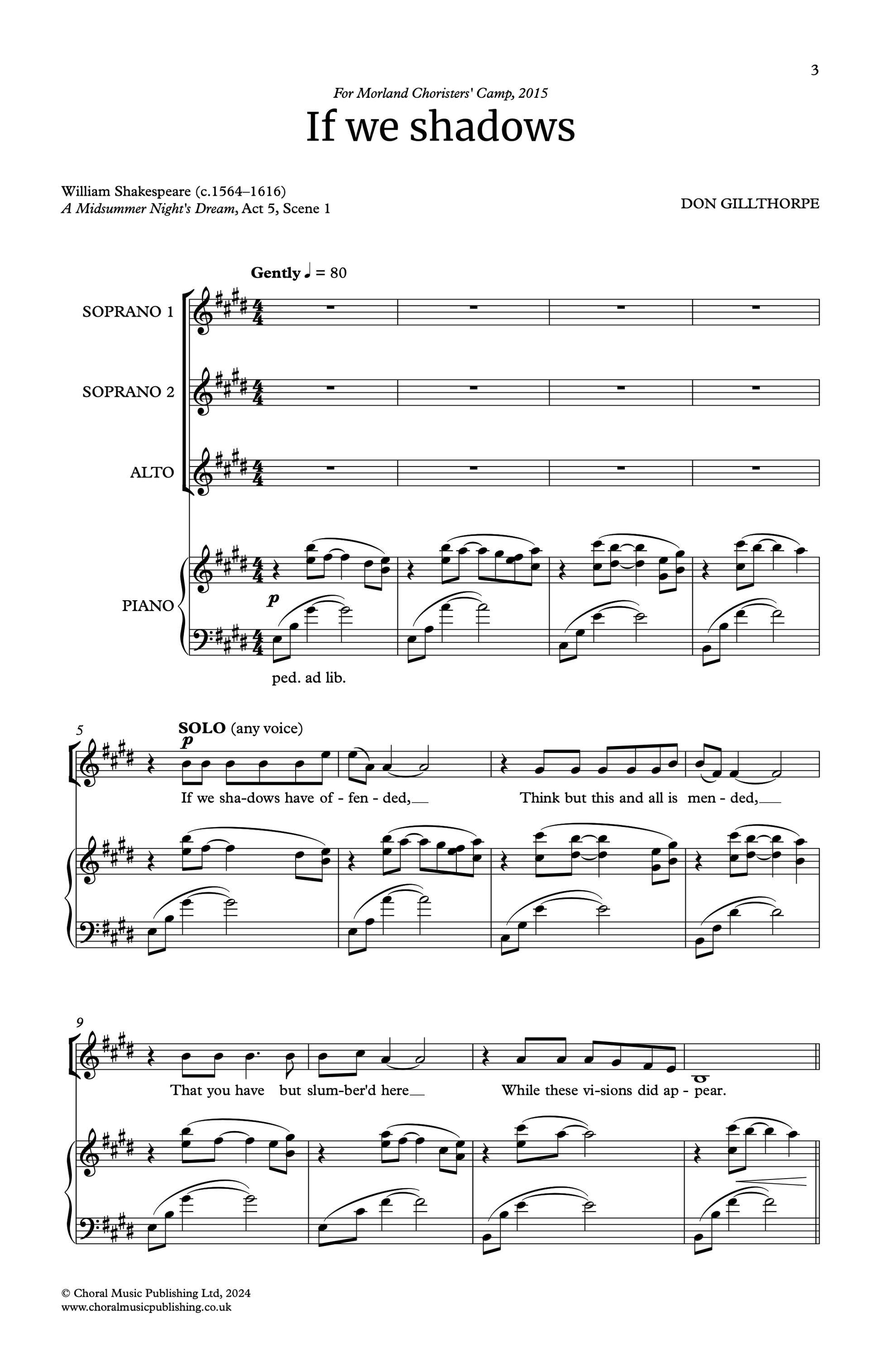 Don Gillthorpe's choral setting of Puck's speech, 'If we shadows have offended' from the end of A Midsummer Night's Dream (Act 5, Scene 1), is a three-part piece with beautiful, flowing melodies. This accessible work is ideal for school or community choirs, allowing singers of varying abilities to engage with the material.
