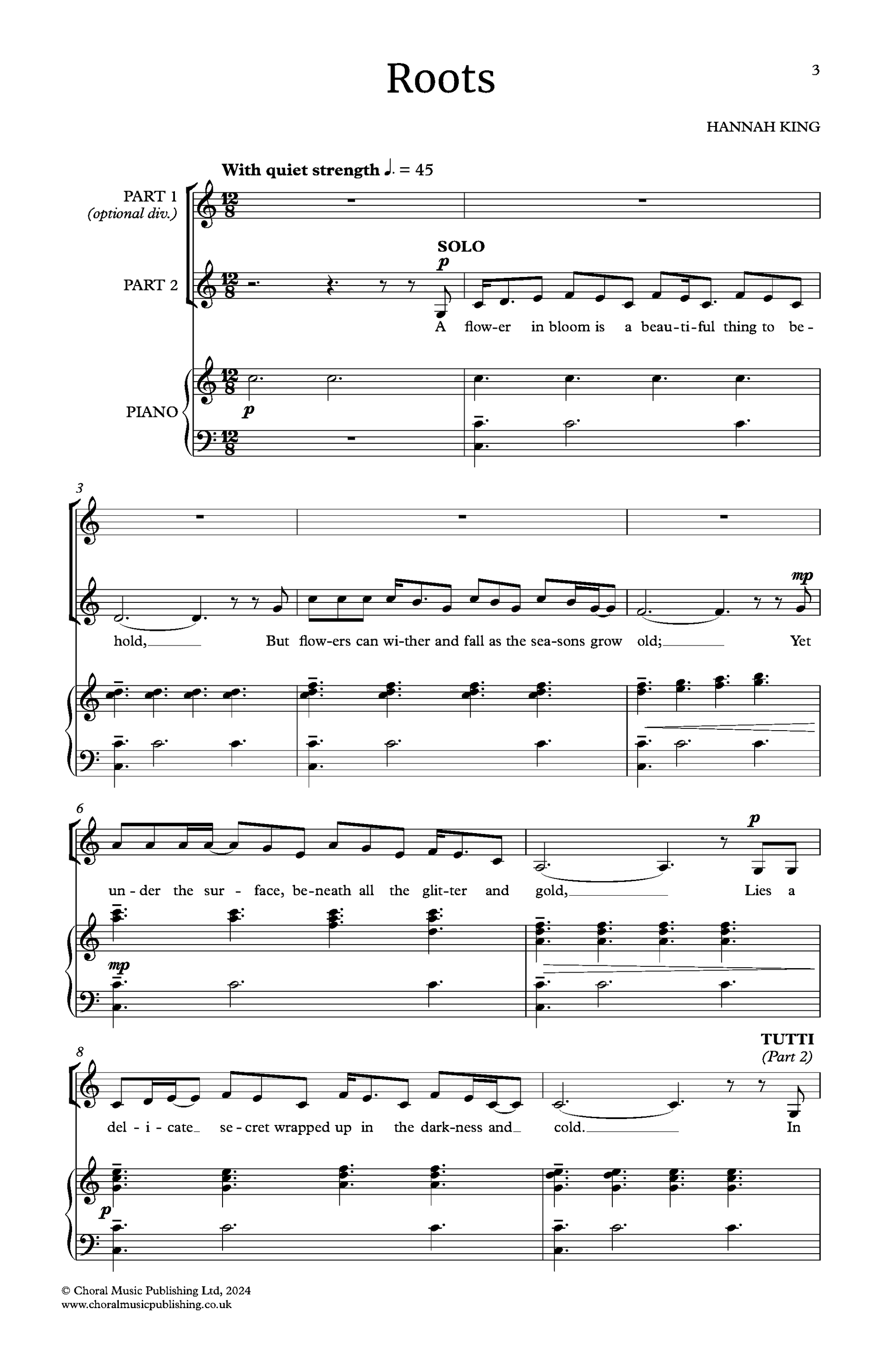 Roots is a song about the quiet power of unseen support, whether that's the sprawling root network of a plant, or our metaphorical human equivalent. The first half talks about the natural world, while the second explores the concept of roots as something we inherit, and something we can choose to put down. It uses a simple folk-inspired melody split between two voice parts, with the option of a third. The initial inspiration for this song was actually a potato, which isn’t very poetic, but nicely captures the idea of something beautiful springing from humble roots!