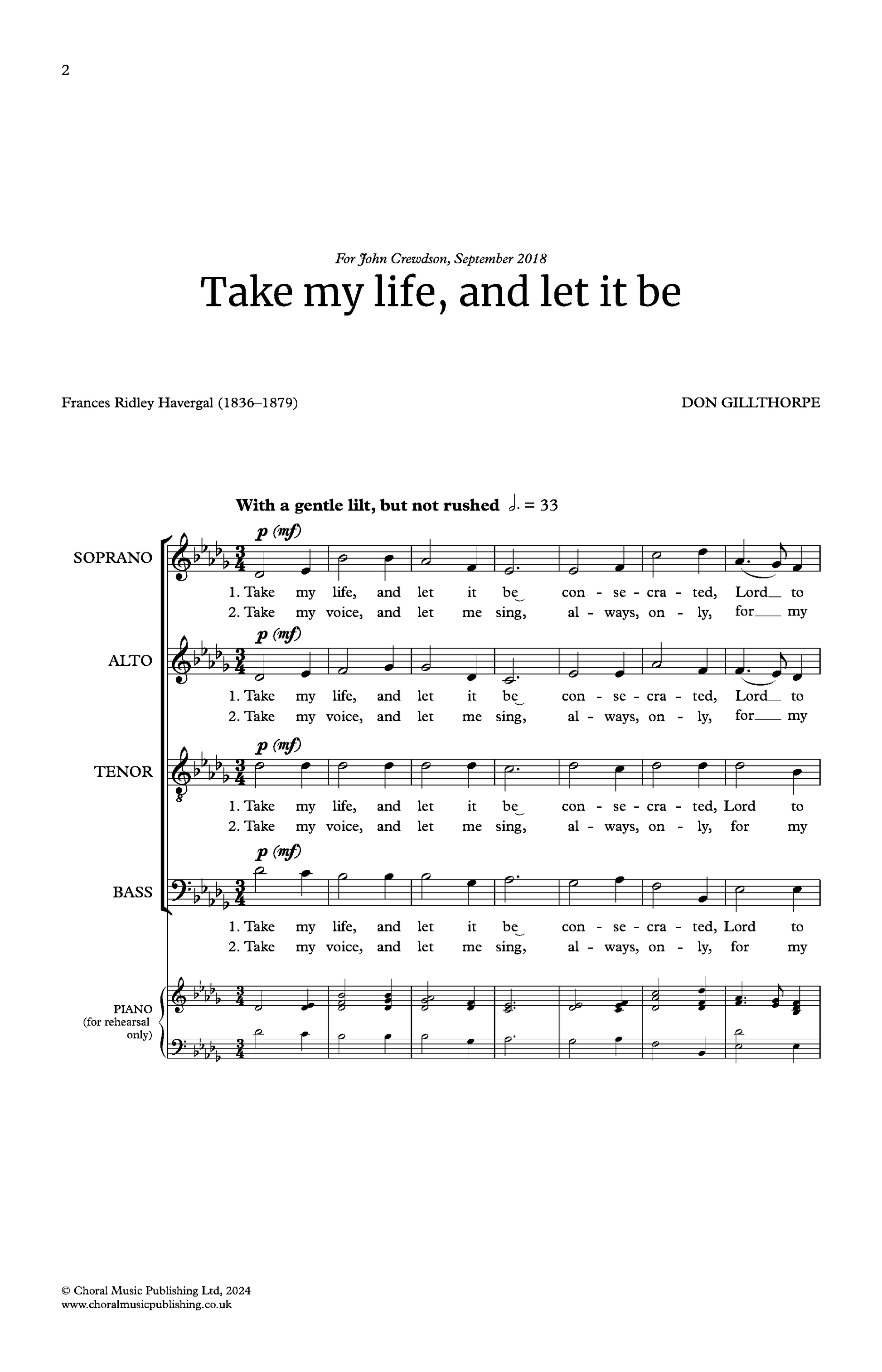 This short unaccompanied SATB setting of three verses from Frances Ridley Havergal's hymn 'Take my life, and let it be' (1836–1879) offers a simple, strophic arrangement that speaks powerfully of service and dedication. Accessible vocal lines make it suitable for church and school choirs, with optional soprano divisi in the final verse adding a touch of richness. Its brevity and lyrical clarity make it an ideal choice for use as an introit or communion motet in worship settings.