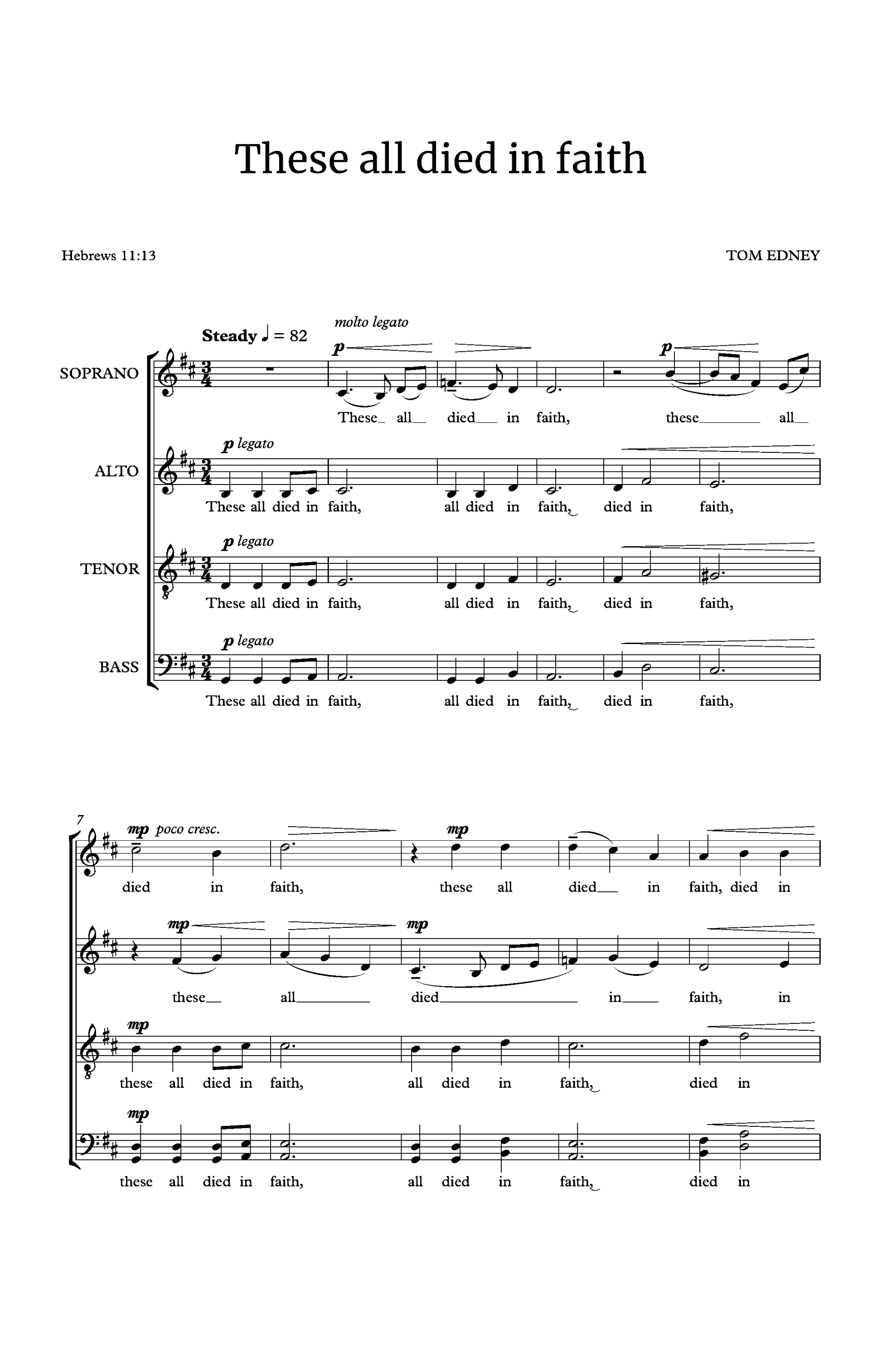 'These all died faith' was written as an introit for a service on Remembrance Sunday in 2021, but could be used throughout the year, especially All Souls and Lent. Originally intended for small forces, this would also work for a larger choir provided the singers are sensitive to the quieter dynamics. As the texture thickens through the piece, individual parts are encouraged to shape phrases as suiting the line rather than strictly obeying dynamics.